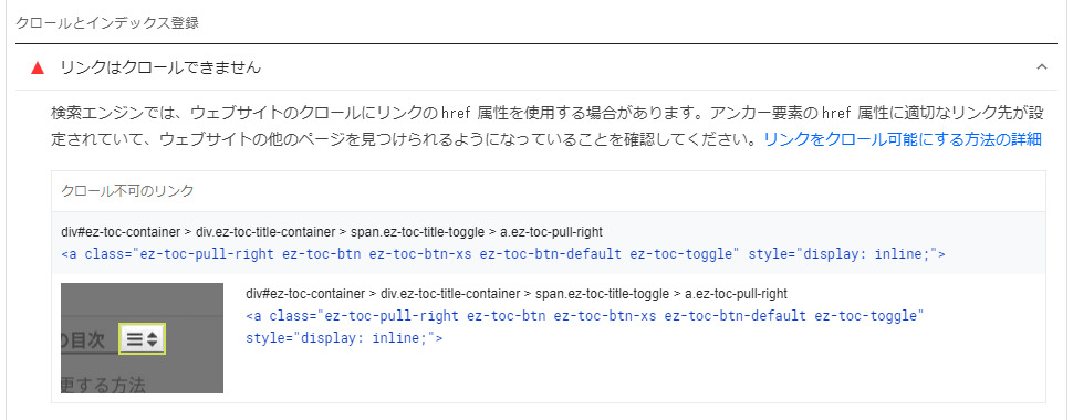 <a onclick="window.open(' ~ '); return false;"> ~ </a>という感じにaタグをボタンとして使用していたり、aタグ内にJavaScriptを使うような部分(SNSシェアボタン)でも“リンクはクロールできません”が出ます...。