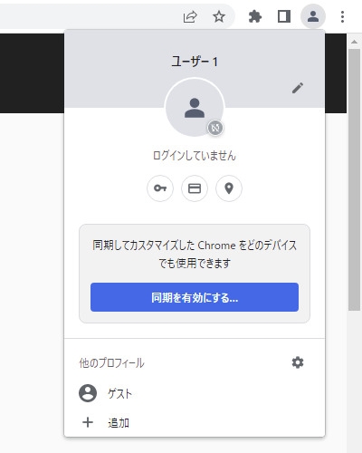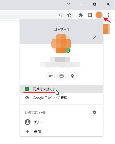 まずはChromeを開き、ブラウザのメニューの横にあるアカウントアイコンを押すと出てくる「同期は有効です」の部分をクリックします。