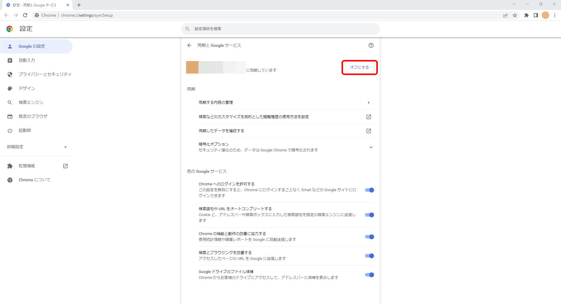 具体的には、Chromeの設定から同期をオフにするときに