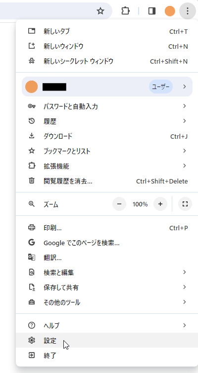 まずはChromeのメニューから「設定」を開きます。