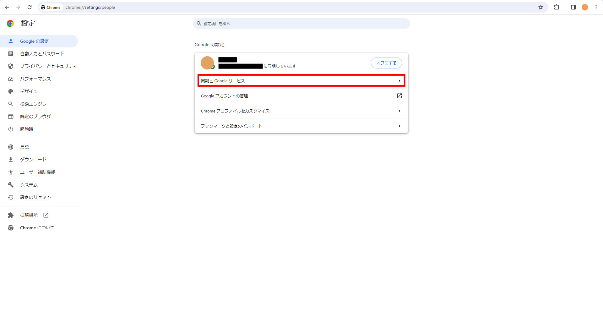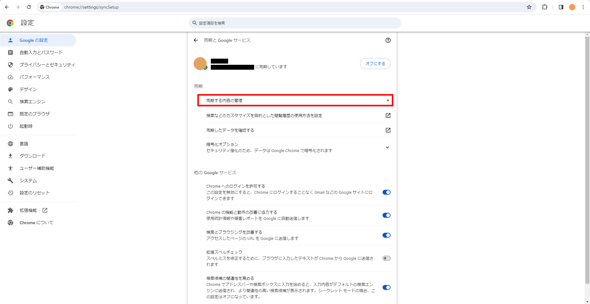 Googleの設定というタブにある「同期とGoogleサービス」の項目に進みます。