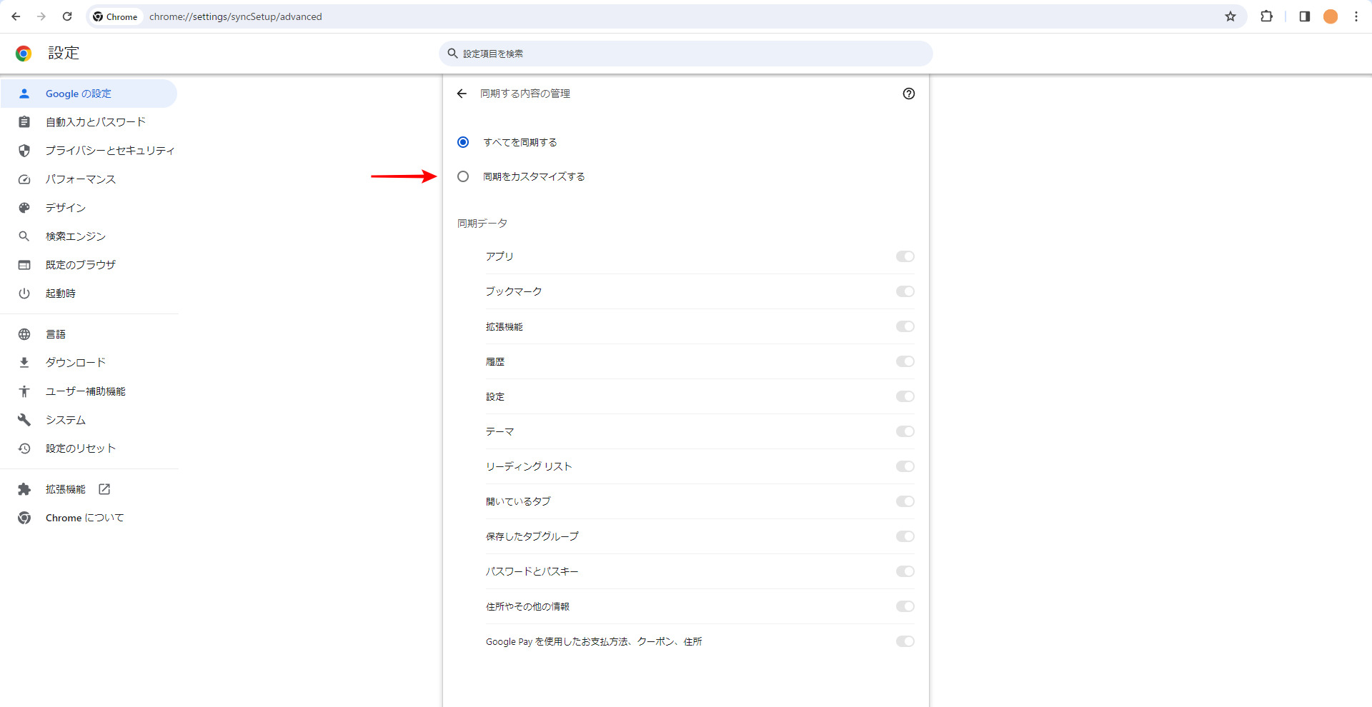 Chromeでは、設定からどんなデータを同期するか?を選択することができます。