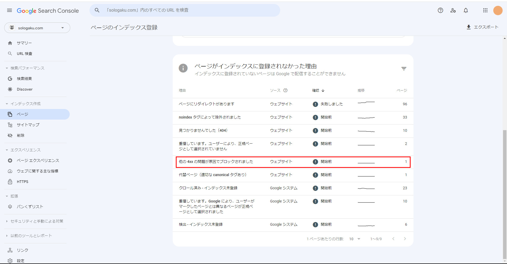 Google Search Console > ページ > 他の4xxの問題が原因でブロックされました > 「修正を検証」