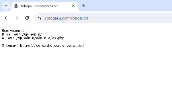 robots.txt User-agent: * Disallow: /wp-admin/ #Allow: /wp-admin/admin-ajax.php ~省略~ Sitemap: https://sologaku.com/sitemap.xml